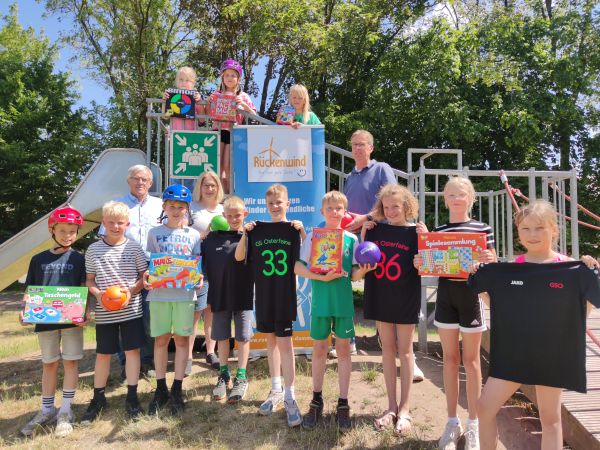 Beim Völkerballturnier aller Grundschulen des Südkreises Vechta glänzten die Osterfeiner Grundschüler in ihren nigelnagelneuen Trikots, die in mit ihrer schwarzen Farbe und dem leuchtend grünen und roten Print ein Bisschen an das Vorbild des großen Sportvereins Schwarz-Weiß Osterfeine erinnern. „Die gewählten Kinder der Schülervertretung durften selber die Farbe und das Design bestimmen“, freute sich Schulleiterin Sabine Bohne über insgesamt 40 Trikots gleich im ganzen doppelten Klassensatz, der auch bei der Fahrradprüfung des Jahrgangs 4 getragen werde. Die Trikots sowie viele neue Spiel- und Sportmöglichkeiten gehören zum Konzert „Förderung durch Bewegung und Spiel“ der Bildungseinrichtung im Dammer Osten. „Um die Konzentrations- und Leistungsfähigkeit unserer Schülerinnen und Schüler optimal unterstützen zu können, ist es notwendig, ihnen während des Unterrichtes vielfältige Bewegungs- und Spielangebote sowohl im offenen Anfang, im Unterricht, in Freiarbeitsphasen, in den Pausen, als auch in den Betreuungszeiten und in den offenen Phasen des Ganztages zu bieten“, erläuterte Bohne das pädagogische Konzept ihrer Schule. Daher habe die Grundschule Osterfeine für den Aufenthalt im Freien eine Spielgeräteausleihe mit vielfältigsten Angeboten an Spielgeräten zur Bewegung und Kreativität auf dem Pausengelände eingerichtet. Auch für den Innenbereich sind diverse Spiele neu angeschafft worden. „Unsere Schülervertretung hatte mehrfach den Wunsch nach neuem Spielmaterial geäußert“, blickte Bohne zurück. Bei einer Inventur erfolgte nun ein „Rundumschlag“: Spielgeräte mit „Altersschwäche“ und unvollständige Brettspiele konnten durch neue und modernere Spiele ausgetauscht werden. Zu den Anschaffungswünschen der Kinder gehörten auch Fahrradhelme, wie sie bei Ausflügen und der Fahrradprüfung zum Pflichteinsatz kommen. „Insgesamt 20 neue Helme konnten wir anschaffen“, so Schulleiterin Bohne, die auch eine „Helmpflicht beim Inline-Fahren“ auf dem Pausenhof eingeführt habe. Sämtliche Neuanschaffungen hat die Stiftung Rückenwind mit insgesamt 3.000 Euro finanziell unterstützt, was die insgesamt derzeit 87 Schülerinnen und Schüler, 8 Kolleginnen und Kollegen sowie 3 pädagogische Mitarbeiter der Grundschule gleichermaßen freut.